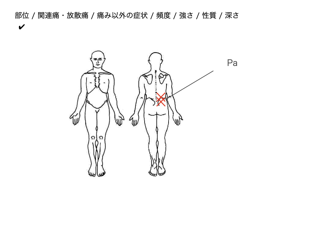 私は、痛みの深さについては聞かないこともあります。優先順位は一番低いです。痛みの深さは患者によっては答えられないことも多く、原因組織を推測することは難しいからです。答えられない場合は、Unclear と記載しています。