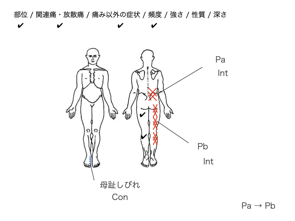 「疼痛が深部に存在し、部位を特定できない(不明瞭な)場合、関連痛の可能性が高い」と言われたりするので、2つ以上の痛みがある場合は確認してもいいかもしれません。