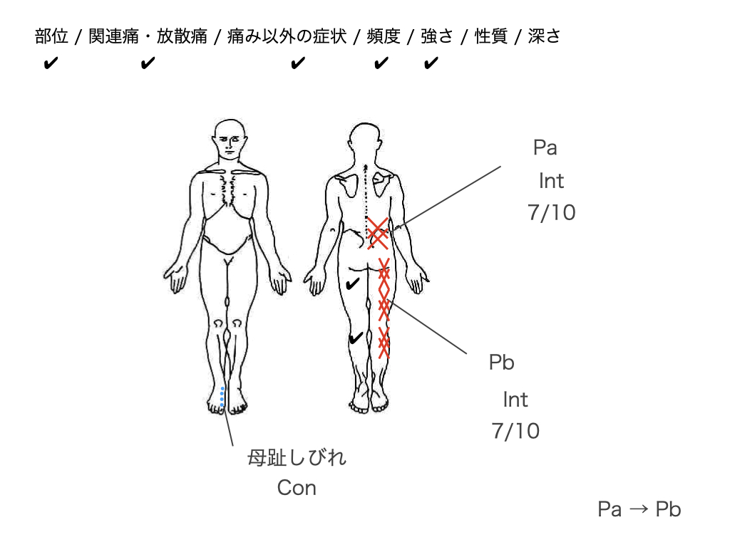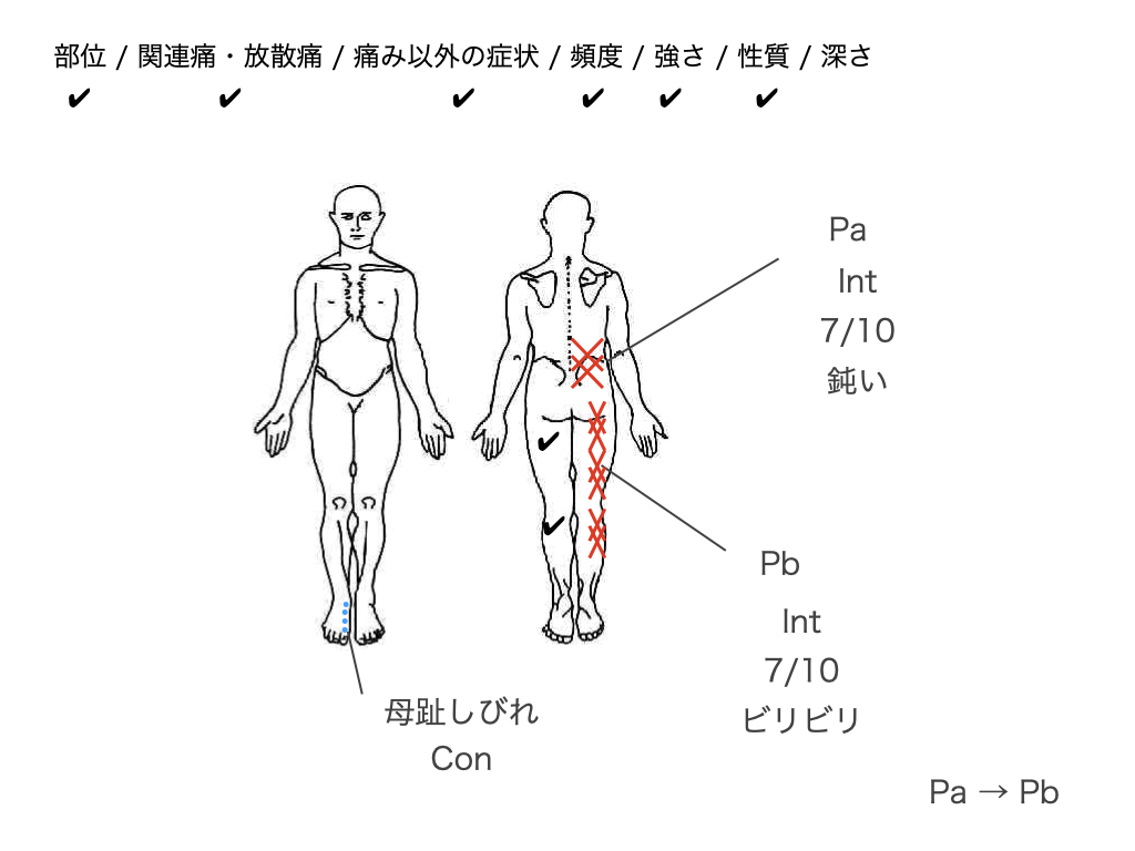 数週間後に、チェックをつけたところに別の症状が出現した場合、症状の増悪または別疾患の出現などを考える必要があります。初回評価でどこに症状があったのか、という記録はとても重要ですね。